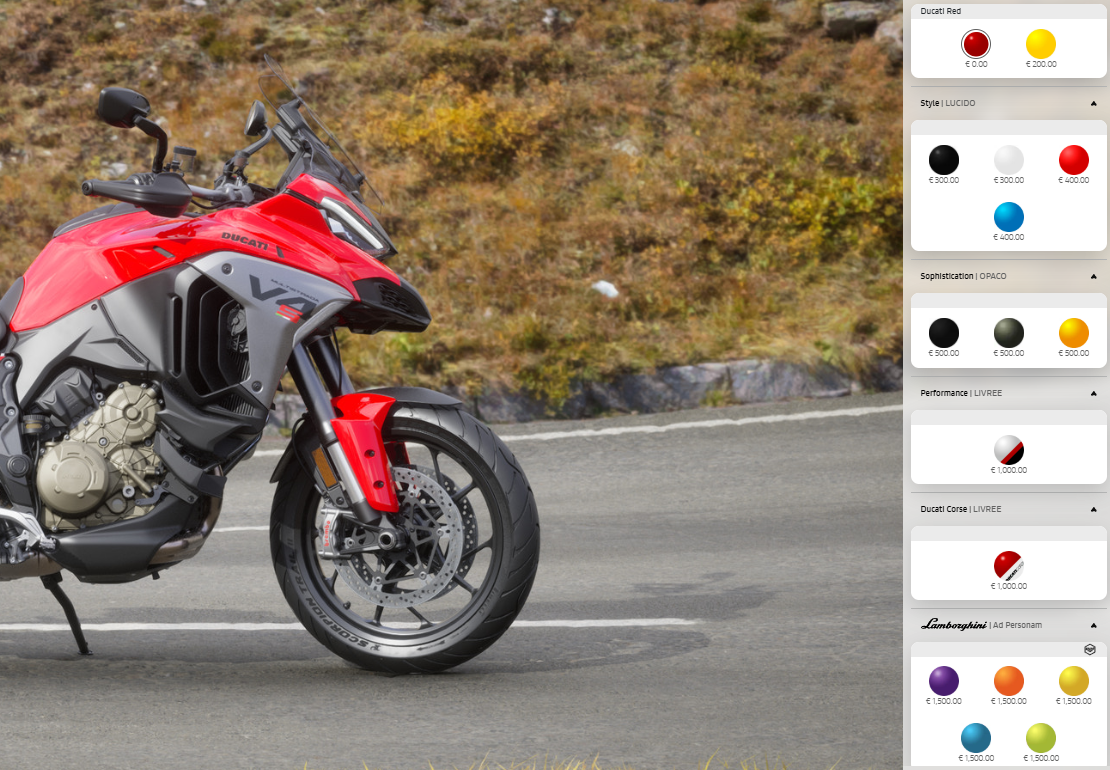 Впервые в своей истории болонский производитель предлагает своим клиентам кастомизировать или, попросту говоря, собрать свой мотоцикл непосредственно в конфигураторе, а не заниматься прикручиваем допов у дилера.